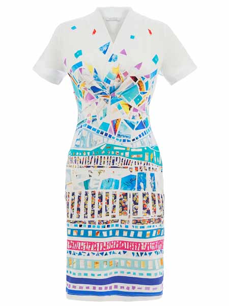 ist die Malerin des Gemäldes, mit dem der Baumwolljersey dieses Kleides von Dolcezza bedruckt ist, Kunst und Mode aus Kanada. Es hat am Rückenteil eine Taillennaht, vorn hat es eine hochgezogene Empirenaht. Es hat einen V-Ausschnitt, parallel dazu ist der Stoff in Falten gelegt bis zur vorderen Mitte an der Empirenaht. Das Kleid ist tailliert, zum Saum hin gerade geschnitten. Die kurzen Ärmel sind uni weiß. Länge in Gr. S ca. 95 cm.