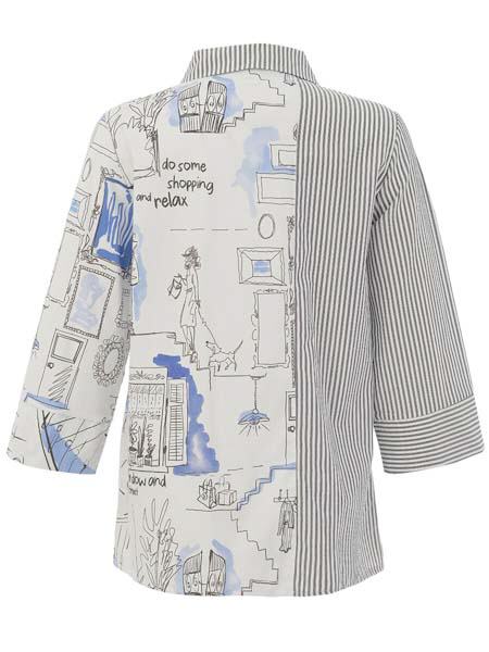 ist das Thema, zu dem diese lange Bluse von Dolcezza gehört. Sie hat einen Hemdblusenkragen, ist vorn durchgeknöpft mit weiß/grauen Knöpfchen. Sie ist teilweise aus längs gestreiftem Stoff in weiß dunkelgrau und teilweise aus einem weißen Stoff, bedruckt in antra mit jeansblau. Vorder- und Rückenteil sind leicht A-förmig geschnitten. Die Ärmel sind 3/4 lang, bequem weit am Saum. Länge in Gr. S ca. 72 cm.