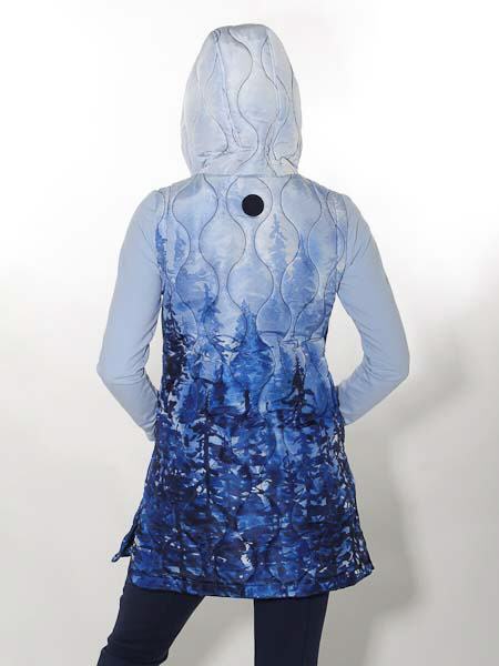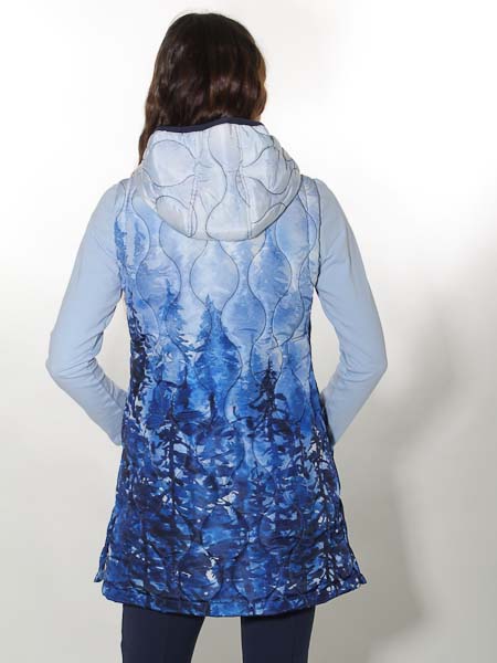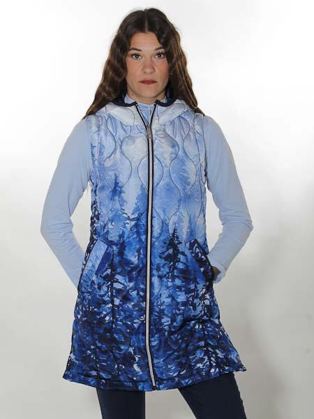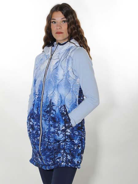 ist der Webstoff dieser Steppweste von Dolcezza, Kunst und Mode aus Kanada. Sie ist dick wattiert in senkrechten Wellenlinien. Sie hat eine Kapuze, innen dunkelblau, wird vorn mit silbernem Zipper geschlossen. Die Weste ist gefüttert mit dunkelblauem Futterstoff. Auf den Vorderteilen sind 2 Pattentaschen. Die lange Weste hat an den Seitennähten Schlitze mit Druckknöpfen, ideal zum Sitzen oder Radfahren. Länge in Gr. S ca. 82 cm.