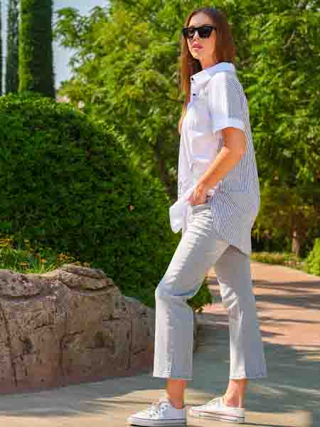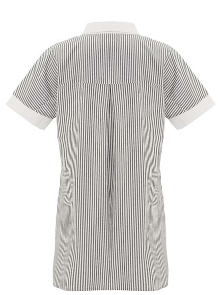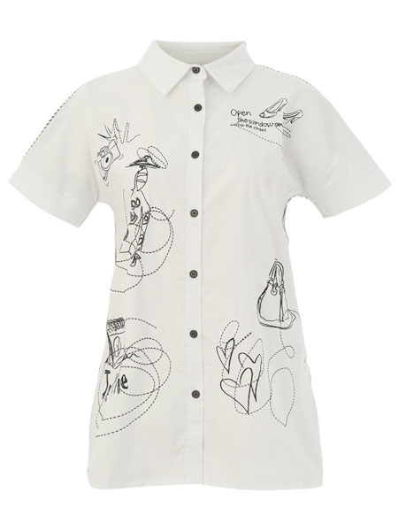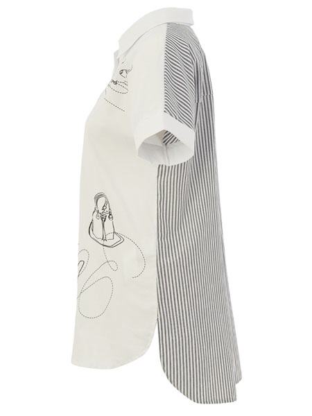 ist das Thema, zu dem diese lange Bluse von Dolcezza gehört. Sie hat einen Hemdblusenkragen, ist vorn durchgeknöpft mit schwarzen Knöpfchen. Kragen und Vorderteile sind uni weiß. Die Vorderteile sind bedruckt mit Motiven aus der Modewelt im Flockprint. Das Rückenteil ist aus längs gestreiftem Stoff in weiß dunkelgrau. Die Schultern sind weit überschnitten, haben als Abschluß einen weißen Aufschlag. Die Bluse hat am Rückenteil eine aufspringende Falte, was eine bequeme Weite am Saum ergibt. Das Rückenteil ist länger als das Vorderteil. Die Saumkanten sind gerundet. Länge in Gr. S ca. 76 cm vorn und ca. 82 cm hinten.