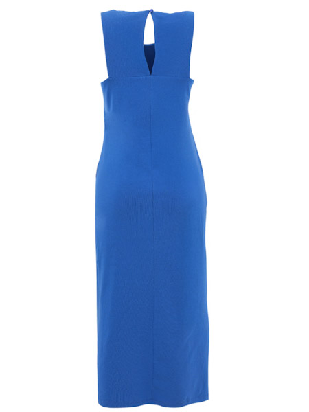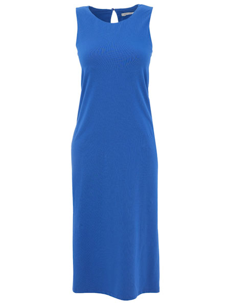 ist das Thema, zu dem dieses knöchellange königsblaue Sommerkleid aus einem Baumwolljersey von Dolcezza gehört, Kunst und Mode aus Kanada. Es hat vorn einen runden Halsausschnitt, hinten hat es an der hinteren Mitte einen Schlitz, gehalten von einem Knopf und Öse. Es ist ärmellos, tailliert, zum Saum hin gerade geschnitten. In den Seitennähten sind Schlitze. Länge in Gr. S ca. 118 cm.