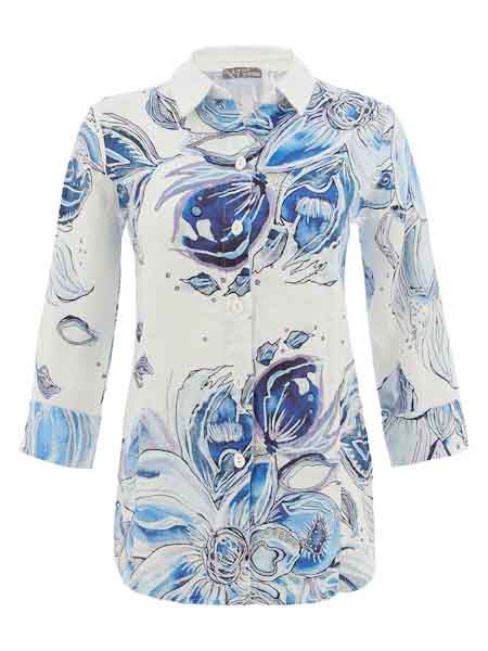 ist die Malerin des Gemäldes, mit dem der Leinenstoff dieser lässigen Bluse von Dolcezza bedruckt ist, Kunst und Mode aus Kanada. Sie hat einen Hemdblusenkragen, ist vorn durchgeknöpft mit weißen Knöpfen. Die Ärmel sind 3/4 lang, sie hat Aufschläge. Die Bluse ist tailliert mit Teilungsnähten, sie hat kurze Schlitze, die Saumkanten sind gerundet. können Sie auch gut als kleine Sommerjacke über Tops oder wie auf dem Foto, über ein ärmelloses Kleid tragen. Länge in Gr. S ca. 72 cm.