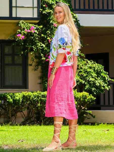ist die Malerin des schönen Gemäldes, mit dem der Leinenstoff dieser Jacke von Dolcezza bedruckt ist, Kunst und Mode aus Kanada, farbintensives Acquarell mit großen Blumen auf uni weiß. Sie ist im Stil einer Jeansjacke geschnitten, hat einen Kragen, wird mit weißen Metallknöpfen geschlossen. Sie hat 2 Pattentaschen in Brusthöhe und 2 senkrechte Eingrifftaschen auf den Vorderteilen. Die Ärmel haben Manschetten. Die schicke Jacke ist leicht tailliert. Länge in Gr. S ca. 56 cm.