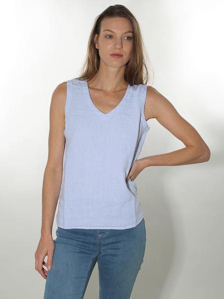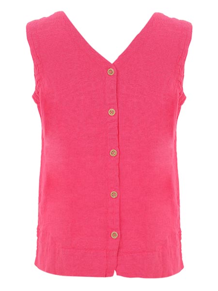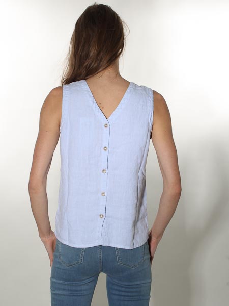 ist das Thema, zu dem diese kurze Leinentop von Dolcezza gehört. Wir haben es in den Farben hellblau und fuchsia vorrätig, aus Leinenwebstoff. Es hat vorn und hinten einen V-Ausschnitt. An der hinteren Mitte ist das Top durchgeknöpft. An den Seitennähten sind kurze Schlitze. Es fällt relativ groß aus. Länge in Gr. S ca. 62 cm.