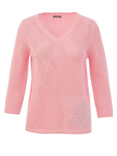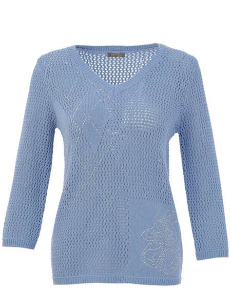 ist das Thema, zu dem dieser grob gestrickte Lochmusterpulli aus Baumwolle von Dolcezza gehört. Wir haben ihn in der Farbe hellblau, sand und in rosa vorrätig. Im Lochmuster sind am Vorderteil rechts Rechtecke glatt rechts eingestrickt, die betont sind mit Linien aus aufgebügelten silbernen Steinchen. Am Vorderteil links ist eine quadratische glatt rechts Fläche, auf der aus aufgebügelten Steinchen eine Blume geformt ist. Der Pulli hat einen V-Ausschnitt, ist gerade geschnitten. Alle Abschlüsse sind in Rippe gestrickt. Die Ärmel sind 7/8 lang. Länge in Gr. S ca. 64 cm.