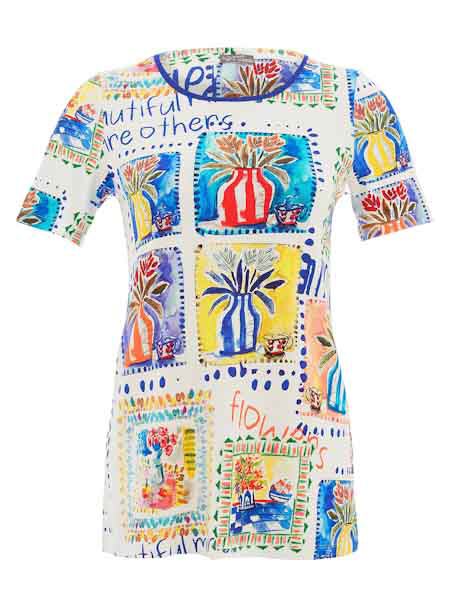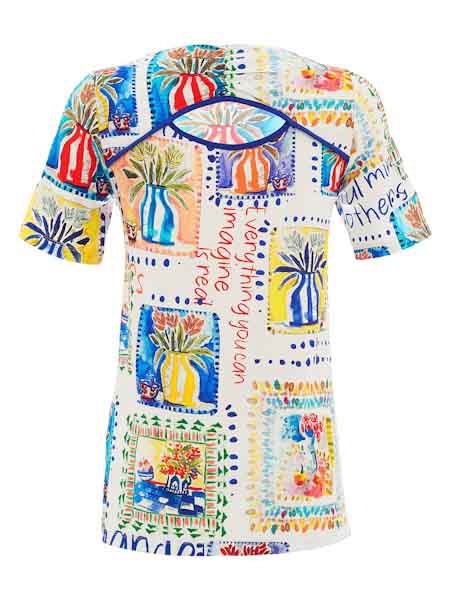 ist die Malerin des Gemäldes, mit dem der Viscosejersey dieses längeren Shirts von Dolcezza bedruckt ist, Kunst und Mode aus Kanada. Es hat einen runden Ausschnitt. An der hinteren Mitte hat es eine Passe, die eine senkrechte Raffung hat, darunter eine elipsenförmige Öffnung, die Ausschnittblenden sind uni königsblau. Die Ärmel sind kurz. Das Shirt ist ein wenig tailliert. Länge in Gr. S ca. 70 cm.