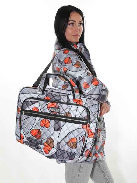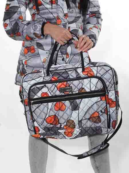 mit einem Gemälde ist der waschbare Polyesterstoff dieser großen Weekend-Tasche, dieser Reisetasche von Dolcezza, Kunst und Mode aus Kanada. Der Stoff ist in kleinen Rauten wattiert und abgesteppt. Die Tasche ist rechteckig, wird oben mit einem Metall-Reißverschluß geschlossen. Sie hat aussen eine aufgesetzte Tasche mit Zipper, 3 cm tief. Auf dieser Tasche ist ein Extra-Reißverschluß. An der Seite hat die Reisetasche eine kleine Tasche. Die Träger sind aus schwarzem Ripsband, in der Länge verstellbar. Die Träger können Sie abtrennen. Innen ist sie schwarz gefüttert, hat 2 Netztaschen. Höhe ca. 35 cm, Breite ca. 49 cm, Tiefe ca. 17 cm. Höhe incl. kurze Träger ca. 59 cm.