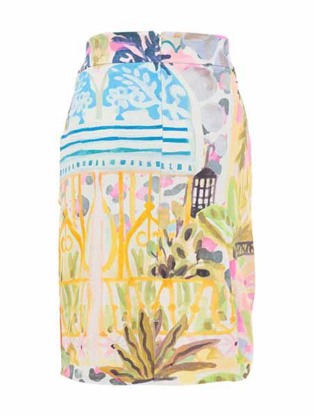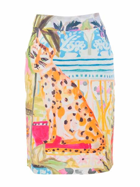 ist die Malerin des Gemäldes, mit dem der etwas dickere Baumwolljersey dieses Rockes von Dolcezza bedruckt ist, Kunst und Mode aus Kanada. Er hat einen 5 cm hohen Bund, wird an der hinteren Mitte mit einem Zipper geschlossen. Es hat vorn 2 Eingrifftaschen. Er ist gerade geschnitten, hat an der hintern Mitte einen kurzen Schlitz. Länge incl. Bund in Gr. S ca. 60 cm.