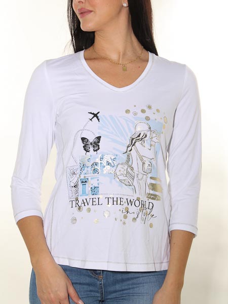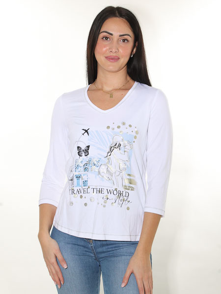 gehört dieses Shirt von Dolcezza, Kunst und Mode aus Kanada. Es hat einen V-Ausschnitt. Der Druck auf dem Vorderteil ist geschmückt mit winzigen silbernen Strasssteinchen. Die Ärmel sind 3/4 lang. Viele Nähte sind betont mit silbernen Kettelnähten. Das Rückenteil ist etwas länger als das Vorderteil. Länge in Gr. S ca. 63 cm vorn und ca. 66 cm hinten.