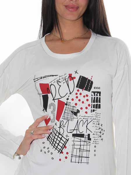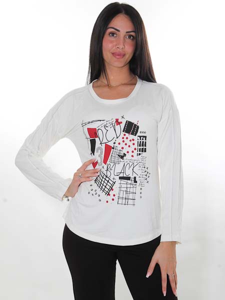 ist die Malerin des Gemäldes, mit dem das Vorderteil dieses Shirts von Dolcezza, Kunst und Mode aus Kanada bedruckt ist. Der Print ist betont mit silbernen Nieten und Steinchen. Es ist aus wollweißem Viscosejersey. Es ist oversized geschnitten mit überschnittenen Schultern und kastig eingesetzten Ärmeln. Das Shirt ist kastig geschnitten, es hat gerundete Saumkanten. Länge in Gr. S ca. 64 cm.