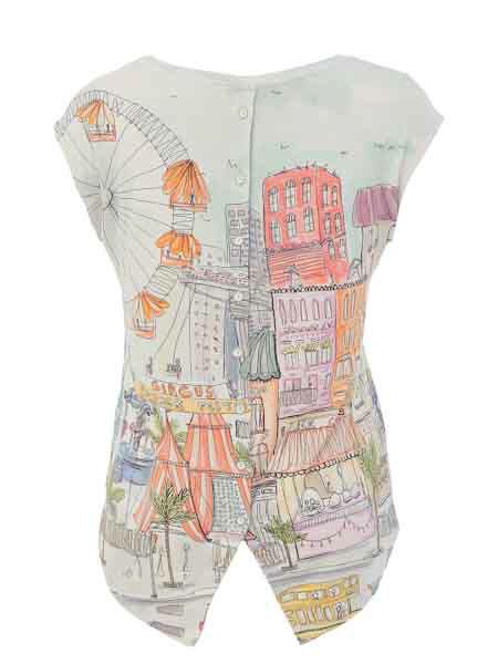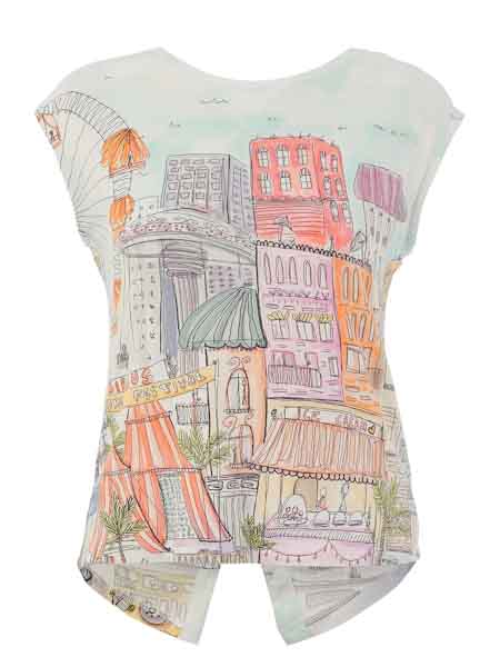 ist die Malerin des Gemäldes, mit dem der Viscosejersey dieses Tops von Dolcezza bedruckt ist, Kunst und Mode aus Kanada. Es hat einen flachen Halsausschnitt, überschnittene Schultern. Das Rückenteil hat eine Knopfleiste mit weiß/silbernen Knöpfchen. Das Shirt ist leicht tailliert, hinten länger als vorn. Länge in Gr. S ca. 59 cm vorn und ca. 72 cm an der hinteren Mitte.