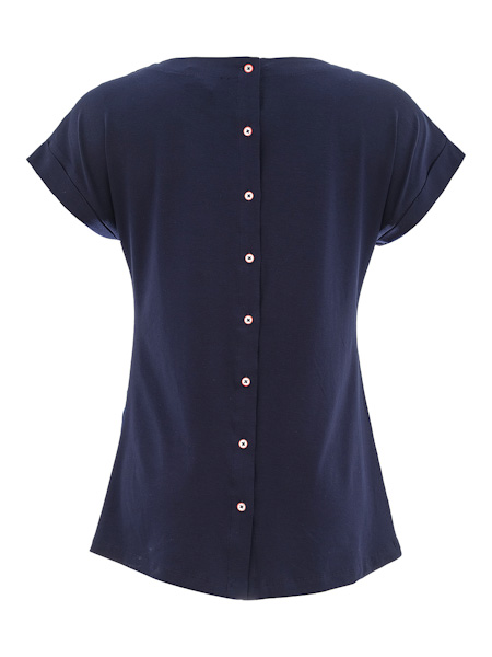 ist die Malerin des Gemäldes, mit dem der Viscosejersey dieses Tops von Dolcezza bedruckt ist, Kunst und Mode aus Kanada. Es hat einen flachen Halsausschnitt, überschnittene Schultern mit einer dunkelblauen Abschlußblende am Armausschnitt. Das Rückenteil ist uni dunkelblau, hat eine Knopfleiste mit weiß/roten Knöpfchen. Das Shirt ist leicht tailliert, hinten länger als vorn. Länge in Gr. S ca. 64 cm vorn und ca. 68 cm an der hinteren Mitte.