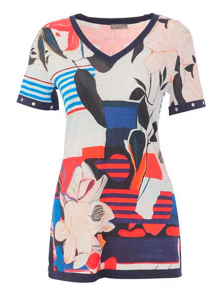 ist die Malerin des Gemäldes, mit dem der Viscosejersey dieser Tunika von Dolcezza bedruckt ist, Kunst und Mode aus Kanada. Sie hat einen V-Ausschnitt mit dunkelblauer Blende. Die kurzen Ärmel haben eine dunkelblaue Abschlußblende, betont mit silbernen Nieten. Die Tunika ist leicht tailliert. Sie hat kurze Schlitze an den Seitennähten, ebenfalls dunkelblau wie auch die Saumkante. Länge in Gr. S ca. 76 cm.