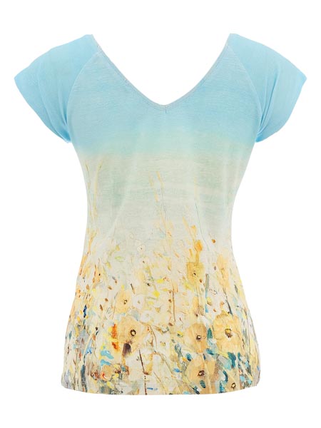 ist der Maler des Gemäldes, mit dem der Viscosejersey dieses Shirts von Dolcezza bedruckt ist, Kunst und Mode aus Kanada. Es hat vorn und hinten einen tiefen V-Ausschnitt, hat kurze Raglanärmel. Das Shirt ist leicht tailliert. Am V-Ausschnitt des Vorderteils sind kleine Falten abgenäht. Länge in Gr. S ca. 61 cm.