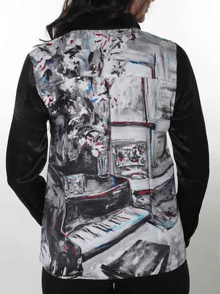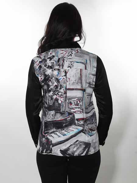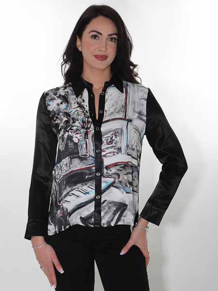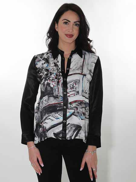 ist die Malerin des Gemäldes, mit dem der Webstoff dieser Bluse von Dolcezza an Vorder- und Rückenteil bedruckt ist. Sie hat einen schwarzen Hemdblusenkragen und eine schwarze Knopflieiste mit kleinen Knöpfen. Auch die Ärmel sind uni schwarz, aus einem leicht glänzendem Webstoff. Die Ärmel haben Manschetten mit Knopfverschluß. Die Bluse ist vorn etwas kürzer als hinten, mit gerundetem Saumabschluß. Länge in Gr. S ca. 62 cm vorn und ca. 67 cm hinten