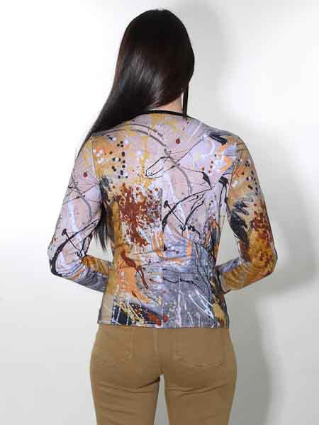 ist die Kunstmalerin des Gemäldes, mit dem der etwas dickere elastische Baumwolljersey bei dieser kurzen Jacke von Dolcezza bedruckt ist, Kunst und Mode aus Kanada. Sie wird mit Metallzipper geschlossen. Sie hat 2 Patten-Taschen auf den Vorderteilen. Auf der Schulternaht und entlang der senkrechten Mitte der Ärmel ist eine schwarze Borte appliziert, betont mit schwarzen eingestanzten Steinchen. Die schicke Jacke ist gut tailliert. Länge in Gr. S ca. 61 cm.