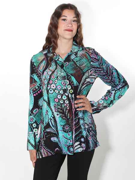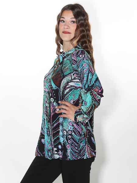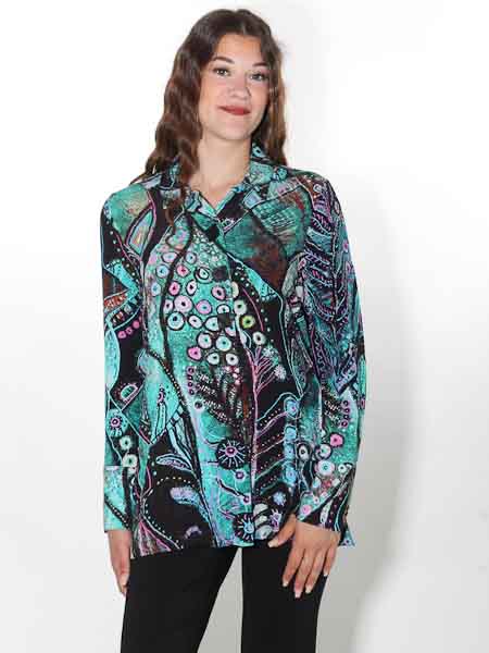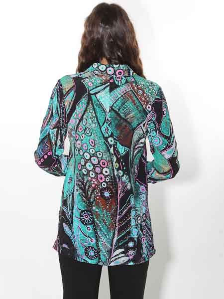 ist die Malerin des Gemäldes, mit dem der Viscosewebstoff dieser langen Bluse von Dolcezza bedruckt ist. Sie hat einen Hemdblusenkragen, ist vorn mit großen quadratischen schwarzen Knöpfen geschlossen bis zur Taille, bis zum Saum hat sie dann eine verdeckte Knopfleiste. Die Bluse ist tailliert, hat an den Seitennähten Schlitze. Die langen Ärmel haben Manschette, die Sie zur Hälfte nach oben schlagen können. Länge in Gr. S ca. 72 cm.