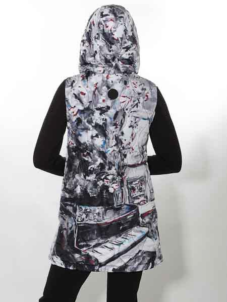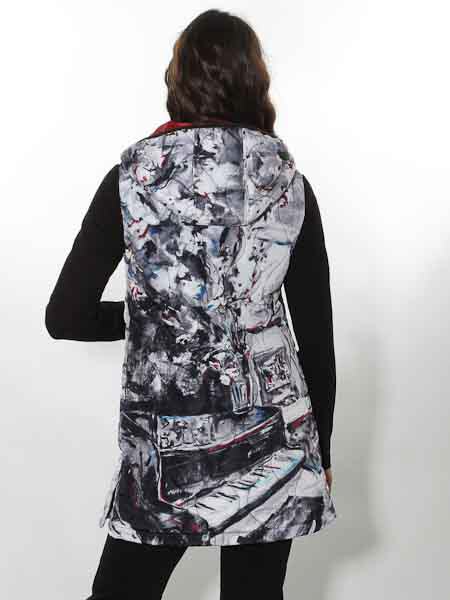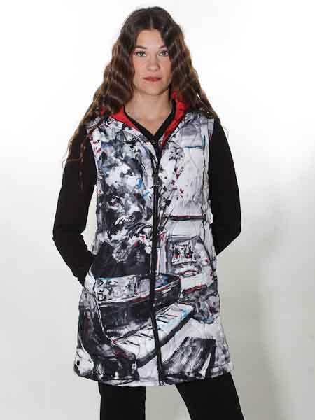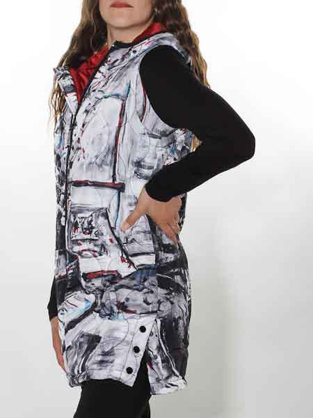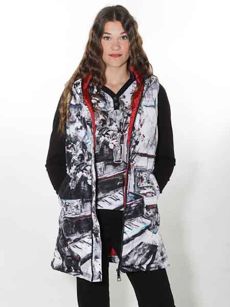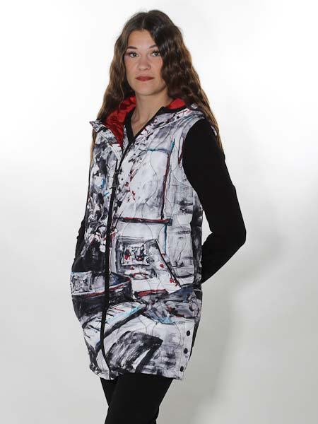 ist die Malerin des Gemäldes, mit dem der Webstoff dieser langen Steppweste von Dolcezza bedruckt ist, Kunst und Mode aus Kanada. Sie hat eine wattierte Kapuze, innen rot gefüttert. Die Absteppung ist in Wellen senkrecht gearbeitet. Sie wird vorn mit schwarzem Zipper geschlossen. Die Weste ist gefüttert mit rotem Futterstoff. Auf den Vorderteilen sind 2 Pattentaschen. Die Seitennähte haben Schlitze, die mit schwarzen Drucknöpfen geschlossen werden, ideal auch zum Sitzen und Radfahren. Länge in Gr. S ca. 80 cm.