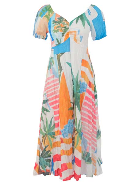 ist die Malerin des Gemäldes, mit dem der leicht gecrashte Baumwollwebstoff dieses sommerlichen Kleides von Dolcezza bedruckt ist, Kunst und Mode aus Kanada. Es hat kurze Raglanärmel, die Abschlußkanten haben einen Gummidurchzug. Am Vorderteil hat es einen V-Ausschnitt, an der vorderen Mitte ist der Stoff gerafft. Das Kleid hat am Rückenteil einen quadratischen Halsausschnitt. Der Stoff ist hinten bis zur leicht hochgezogenen Taillennaht gesmokt, was eine gute Paßform bringt. Das Rockteil ist zum Saum hin ausgestellt, herrlich an heißen Tagen. Länge in Gr. S ca. 122 cm.