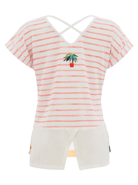 ist die Malerin des Gemäldes, mit dem der Viscosejersey am Vorderteil dieses längeren Shirts von Dolcezza bedruckt ist, Kunst und Mode aus Kanada. Der weiße Viscosejersey am Rückenteil ist verwaschen bedruckt mit himbeerfarbenen Querstreifen. Das Rückenteil hat einen tiefen V-Ausschnitt, der gehalten wird mit 2 überkreuzten weißen Bändern. Unter dem V-Ausschnitt ist eine kleine Palme aufgedruckt. Die breiten Saumkanten sind aus uni weißem Webstoff. Das Rückenteil ist etwas länger als das Rückenteil. Die Schultern sind überschnitten, haben als Abschluß eine Blende aus geringeltem Jersey in weiß himbeere. Länge in Gr. S ca. 64 cm vorn und 68 cm hinten.