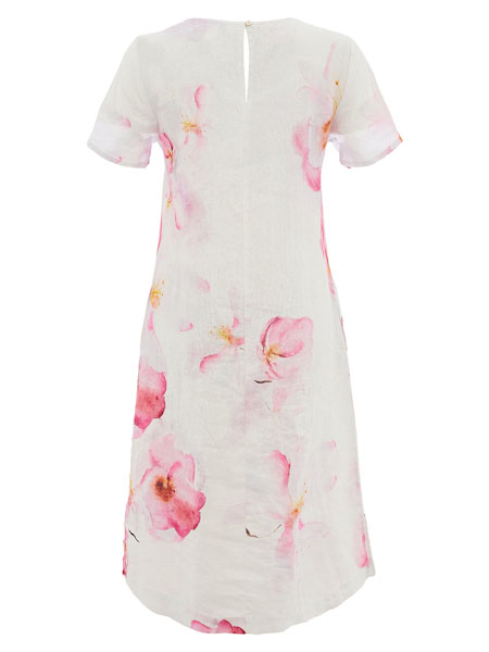 ist die Malerin des schönen Gemäldes, mit dem der Leinenwebstoff dieses sommerlichen Kleides von Dolcezza bedruckt ist, Kunst und Mode aus Kanada. Es hat einen runden Ausschnitt. An der hinteren Mitte hat es einen Schlitz mit Knopf und Öse. Es ist etwas tailliert, zum Saum hin leicht ausgestellt. Es hat Taschen in den Seitennähten. Länge in Gr. S ca. 112 cm.