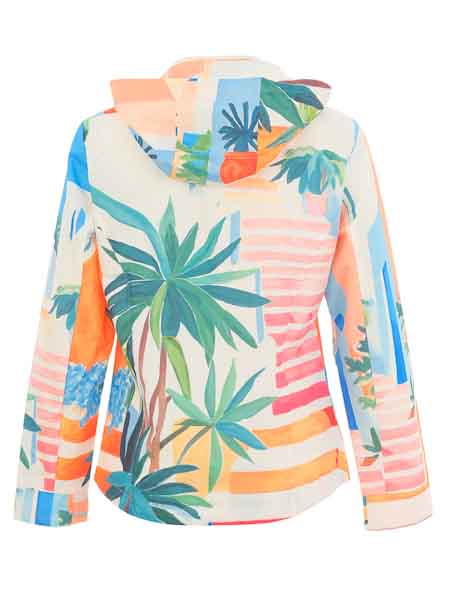 ist die Malerin des Gemäldes, mit dem der Webstoff dieser Outdoor Sport Jacke von Dolcezza bedruckt ist, Kunst und Mode aus Kanada. Sie hat eine große Kapuze, einen hohen Stehkragen. Sie wird an der vorderen Mitte mit Zipper geschlossen. Vorder- und Rückenteil sowie die Kapuze sind gefüttert mit Mesh Stoff, mit einem elastischen weißen Netzstoff, atmungsaktiv. Die Ärmel sind lang, die Weite der Ärmel läßt sich verstellen mit Klettband. Auf den Vorderteilen sind 2 Taschen mit Zipper. Die Jacke ist gerade geschnitten, die Weite am Saum läßt sich innen mit Bändern raffen. Der Stoff ist wasserabweisend, winddicht, atmungsaktiv, er hat versiegelte Nähte. Länge in Gr. S ca. 61 cm.