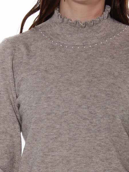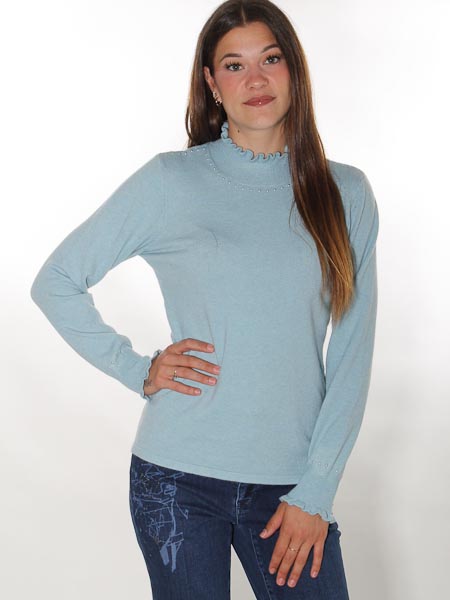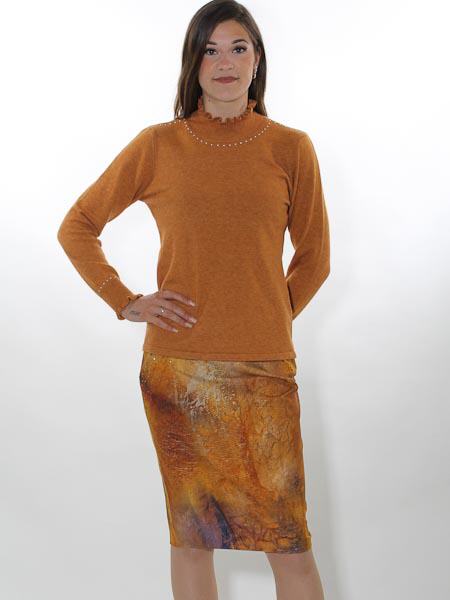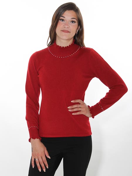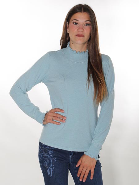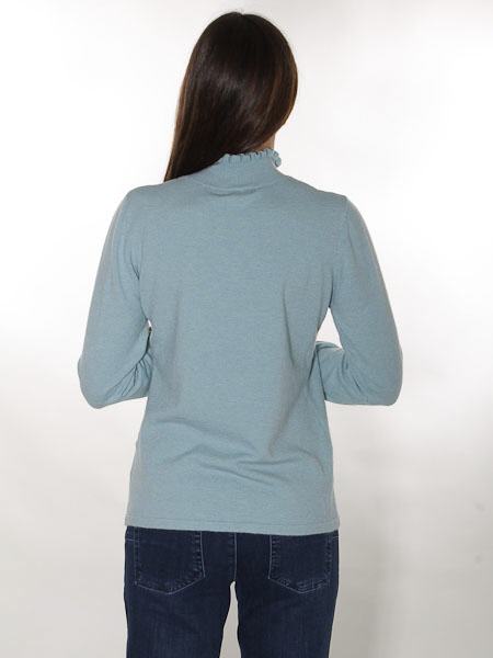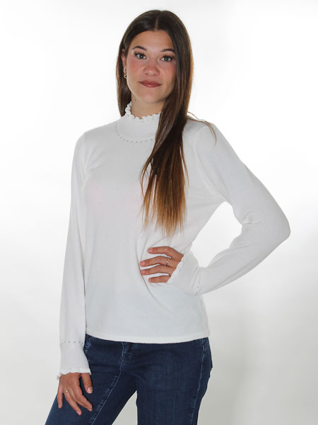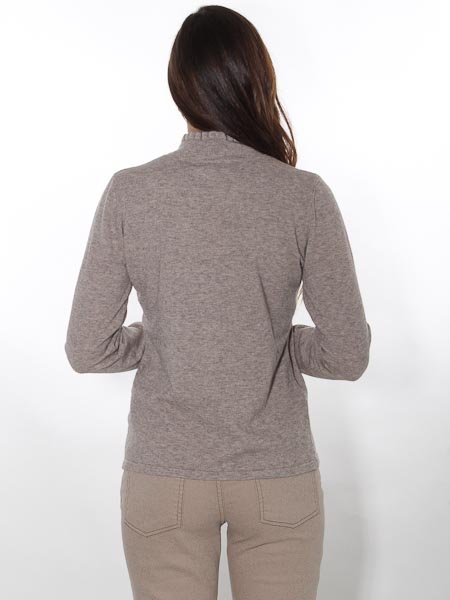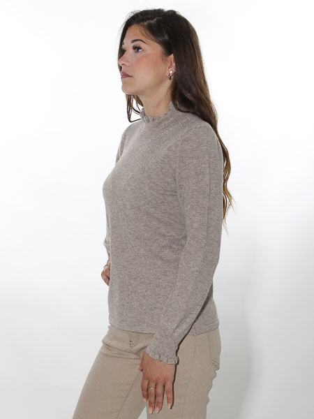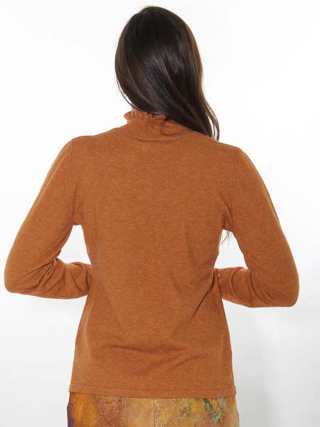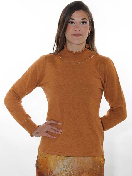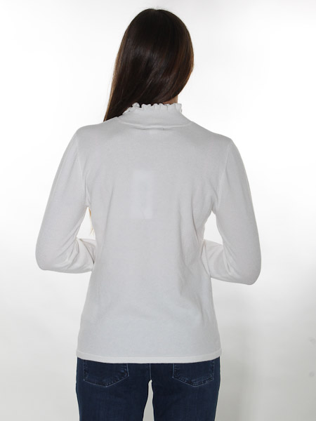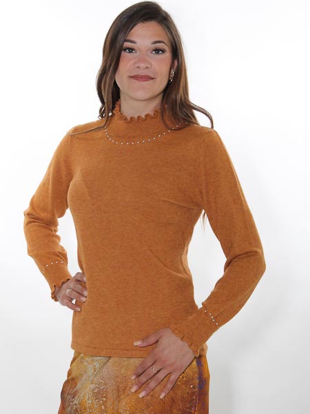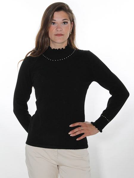 ist das Thema, zu dem dieser kuschelig weiche Pulli von Dolcezza gehört, Kunst und Mode aus Kanada. Wir haben ihn in schwarz, kirschrot, wollweiß, sand und in curry. Er hat einen hohen Stehkragen, die Abschlüsse an Stehkragen und Ärmeln sind im Rippenmuster und dann mit kleiner Rüsche gestrickt. Der Pulli ist leicht tailliert. Die Schulternaht, der vordere Halsausschnitt und die Ärmelrippenabschlüsse sind betont mit kleinen silbernen Steinchen. Länge ca. 60 cm.