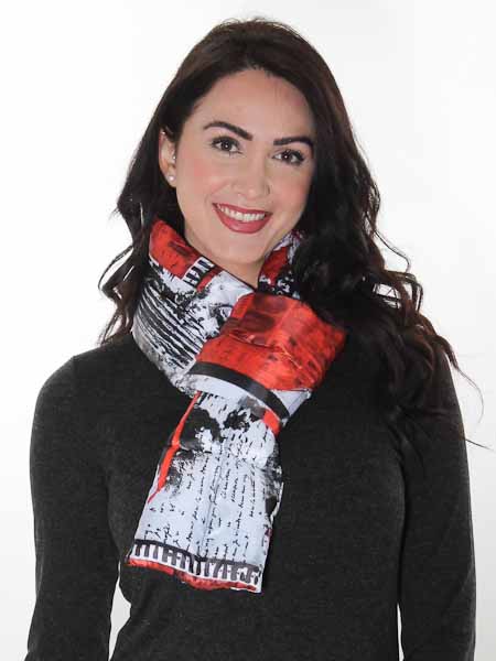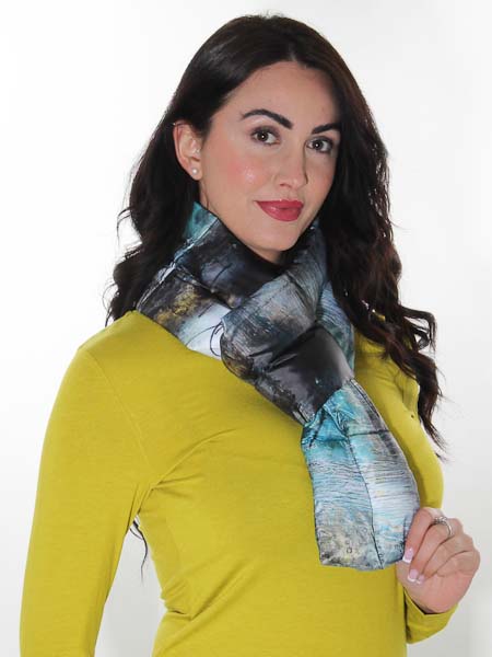 haben wir diesen wattierten Schlaufenschal, von 2 Künstlern gemalt, Kunst und Mode aus Kanada. Er ist gefüttert mit sehr weichem Plüschstoff in schwarz, angenehm am Hals. Länge ca. 96 cm, Breite ca. 14 cm.