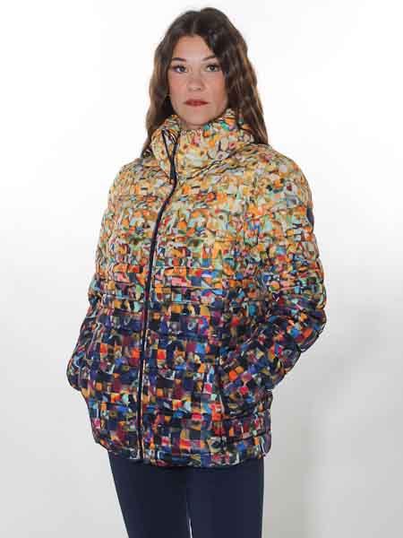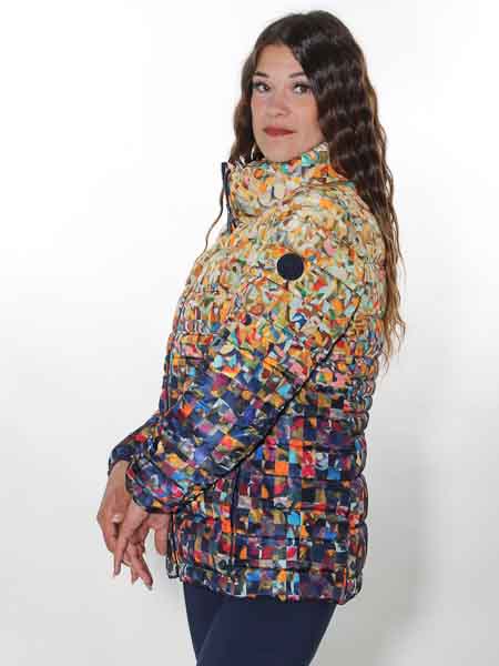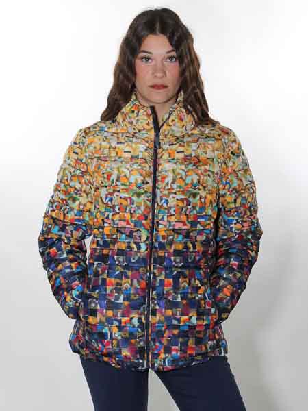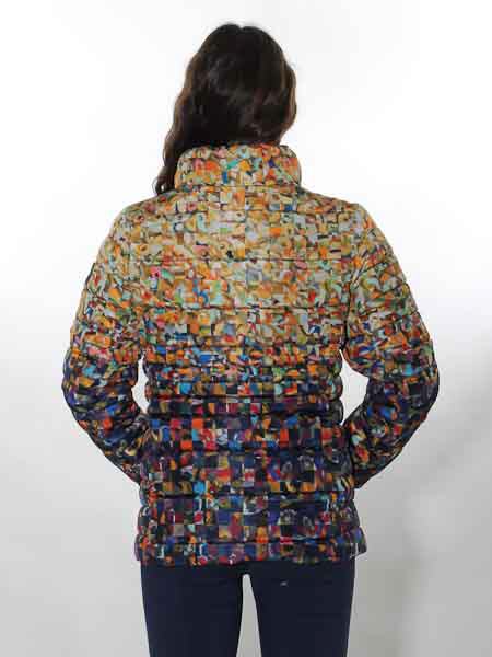 ist die Malerin des Gemäldes, mit dem der Webstoff dieser Steppjacke von Dolcezza bedruckt ist. Sie ist wattiert und waagrecht abgesteppt. Sie hat einen hohen wattierten Stehkragen. Die Steppjacke wird mit einem schwarzen Zipper geschlossen. Sie hat an den Vorderteilen 2 Reißverschlußtaschen in den senkrechten Teilungsnähten. Die Jacke ist leicht tailliert, ist dunkelblau gefüttert. Die langen Ärmel haben als Abschluß einen schmalen dunkelblauen Gummibund. Länge in Gr. S ca. 69 cm.