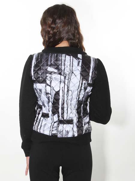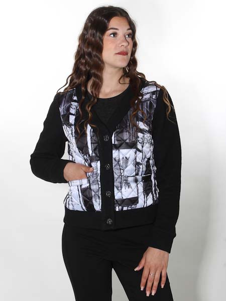 ist die Malerin des Gemäldes, mit dem der leicht glänzende Webstoff an Rücken- und Vorderteilen dieser Jacke von Dolcezza bedruckt ist. Rücken- und Vorderteile sind leicht wattiert und in Rauten abgesteppt. Sie sind mit schwarzem Futterstoff gefüttert. Die schwarzen Partien sind aus einem etwas dickeren strukturierten Strickstoff. Die Jacke hat einen V-Ausschnitt, ist vorn durchgeknöpft. Sie hat 2 Taschen auf den Vorderteilen. Länge ca. 55 cm.