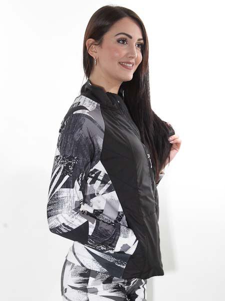 ist die Kunstmalerin des Gemäldes, mit dem der etwas dickere Jersey bei dieser kurzen Jacke von Dolcezza am Rückenteil sowie den Raglanärmeln bedruckt ist, Kunst und Mode aus Kanada. Die mittlere Partie der Vorderteile sind aus schwarzem Webstoff, leicht wattiert und abgesteppt. Sie wird mit Metallzipper geschlossen. Der Stehkragen ist außen aus schwarzem Stoff, innen aus bedrucktem Jersey. Sie hat 2 RV-Taschen in den Teilungsnähten. Die Ärmel haben Manschetten. Die schicke Jacke ist gut tailliert. Länge in Gr. S ca. 63 cm.