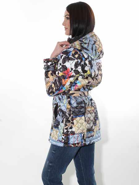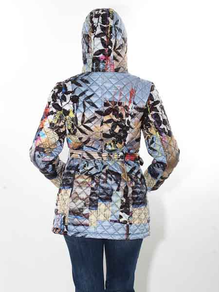 ist die Malerin des Gemäldes, mit dem der Stoff dieser langen Steppjacke von Dolcezza, Kunst und Mode aus Kanada, bedruckt ist. Sie wird mit einem Metallzipper geschlossen. Auf den Vorderteilen hat sie 2 RV-Taschen. Sie hat einen Stehkragen und eine Kapuze. Sie ist wattiert und gesteppt, das Innenfutter ist uni schwarz. Sie hat einen Gürtel mit Metallverschluß. Länge der Steppjacke in Gr. S ca. 80 cm.