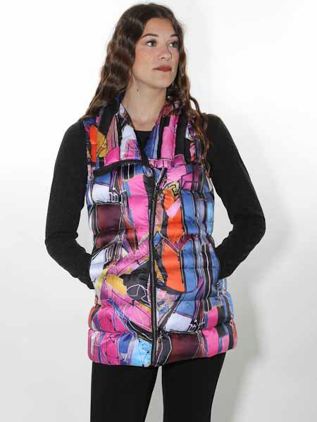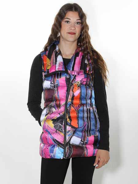 ist die Malerin des Gemäldes, mit dem der Webstoff dieser Steppweste von Dolcezza bedruckt ist, Kunst und Mode aus Kanada. Sie hat einen Kragen, wird vorn asymmetrisch mit Zipper geschlossen. Wie bei einer Bikerjacke können Sie den Kragen offen oder schlossen tragen. Die Weste ist gefüttert mit schwarzem Futterstoff. Auf den Vorderteilen sind 2 Reißverschlußtaschen. Länge in Gr. S ca. 70 cm.