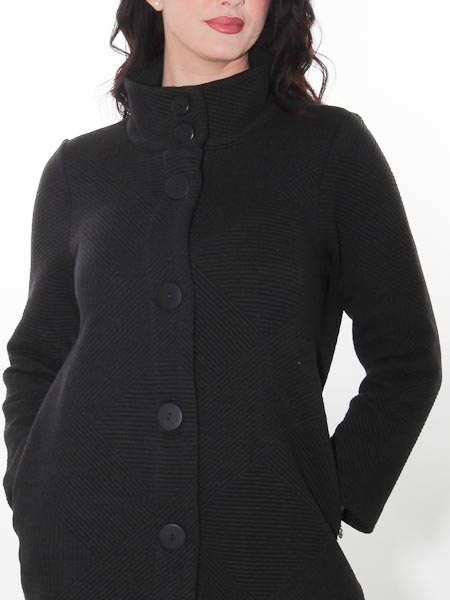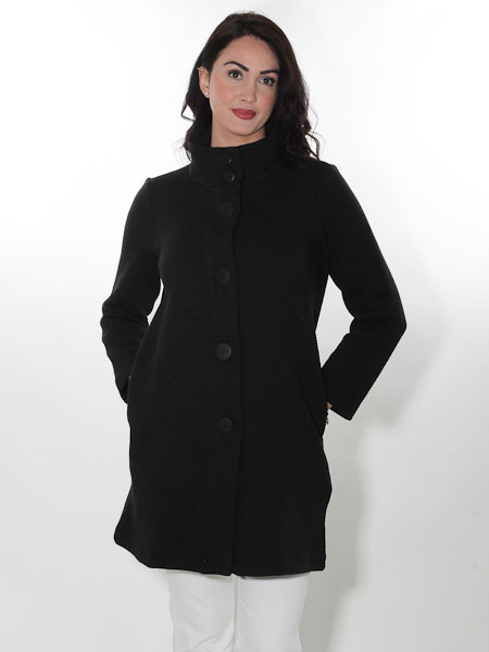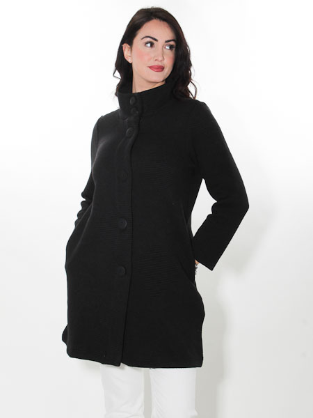 ist das Thema, zu dem dieser Strickmantel von Dolcezza gehört, Kunst und Mode aus Kanada, wir haben ihn in der Farbe schwarz. Er ist gearbeitet aus 2 verschiedenen dicken Strickstoffen. Er hat einen hohen Stehkragen, wird mit gro0en schwarzen Knöpfen geschlossen. Er hat 2 große Taschen auf den Vorderteilen. Er ist leicht A-förmig geschnitten. Länge ca. 82 cm.
