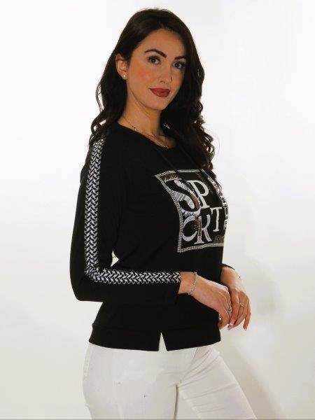 ist das Thema, zu dem dieses Sweatshirt, dieser Pulli von Dolcezza gehört, Kunst und Mode aus Kanada. Er ist gearbeitet aus einem dickeren schwarzen Jersey und aus einem leichten Strickstoff in einem klassischen schwarz/weiß Muster. Das Vorderteil ist bestickt mit Buchstaben, einige Flächen sind geformt aus kupferfarbenen aufgebügelten Steinchen. Die quadratische Umrandung ist geformt aus weißen Steinchen. Er hat einen runden Halsausschnitt, die Halsblende hat einen Tunnel mit durchgezogenen Kordeln. Er ist leicht tailliert. Die Saumblende hat am Vorderteil 2 Schlitze. Die Ärmel sind betont mit senkrechten Einsätzen in schwarz/weißem Strickstoff. Länge ca. 63 cm.
