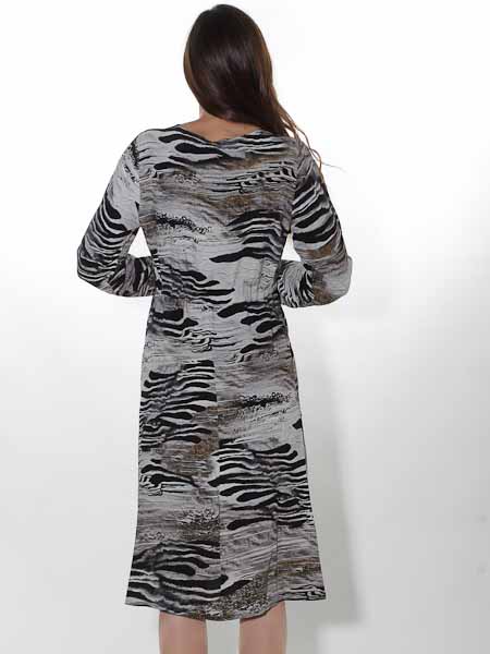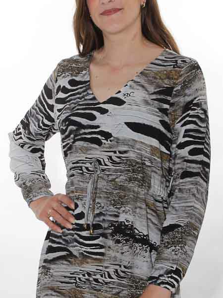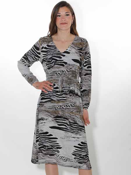 ist die Kunstmalerin des Gemäldes, mit dem der Viscosewebstoff dieses Kleides von Dolcezza bedruckt ist. Es hat einen V-Ausschnitt. Die Taille ist etwas hochgezogen wie eine Empirenaht, das Kleid hat dort einen Tunnel mit Stoffgürtel. Das Kleid ist zum Saum hin leicht ausgestellt. Die Ärmel sind lang, haben als Abschluß einen Gummidurchzug. Länge in Gr. S ca. 110 cm.