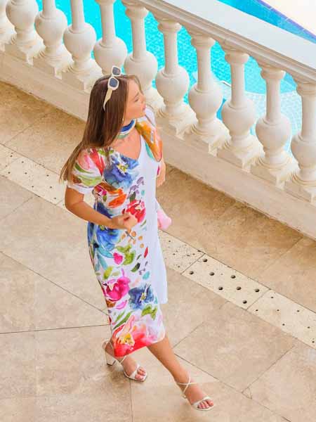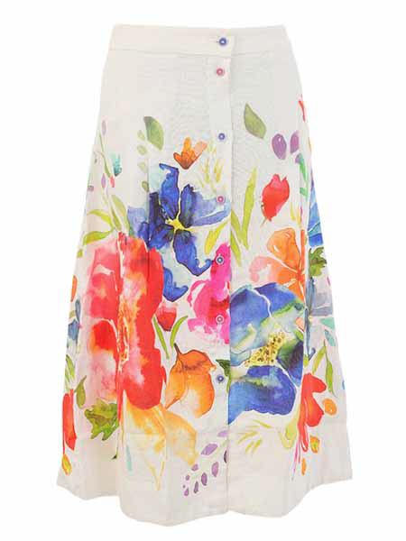 ist die Malerin des Gemäldes, mit dem der Leinenstoff dieses Rockes von Dolcezza bedruckt ist, Kunst und Mode aus Kanada. Er hat einen festen Bund von 4 cm Höhe. Der Rock ist durchgeknöpft bis zum Saum mit verschieden farbigen Knöpfen. Er ist zum Saum hin ausgestellt, hat am vorderen Rockteil 2 Falten unter dem Bund, die nach unten aufspringen. Der Rock hat 2 Eingrifftaschen vorn. Auf den Vorderteilen hat er 2 aufgesetzte Taschen. Länge in Gr. S ca. 77 cm.