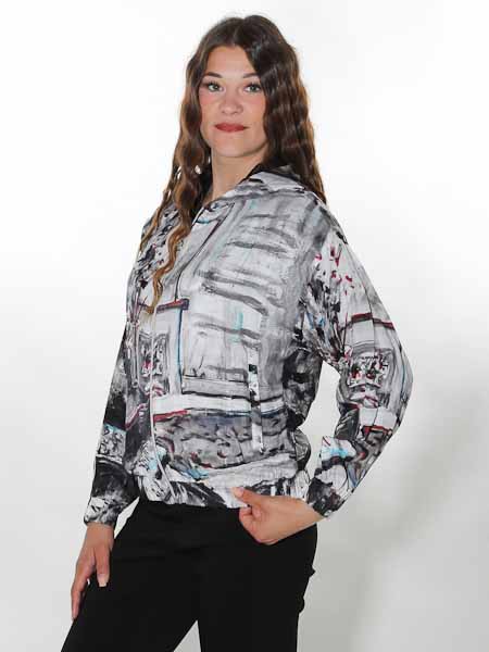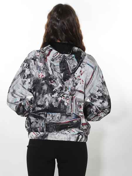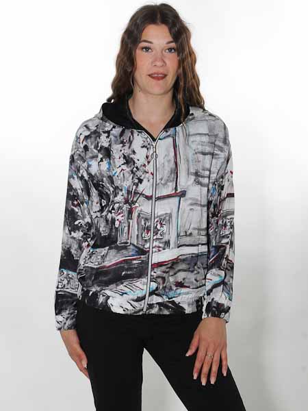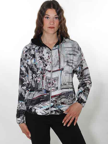 ist die Malerin des Gemäldes, mit dem der Webstoff dieser Kapuzenjacke in Blousonform von Dolcezza bedruckt ist. Sie hat eine Kapuze, innen uni schwarz. Sie wird mit silbernem Metallzipper geschlossen. Am Saum und an den Ärmelenden hat sie breite Gummidurchzüge. Die Jacke hat überschnittene Schultern und gerade eingesetzte Ärmel. Auf den Vorderteilen sind 2 senkrechte Pattentaschen. Länge in Gr. S ca. 59 cm.