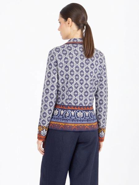 ist die Grundfarbe dieser schönen Strickjacke von Ivko, im Jacquardmuster im mediterranen Muster mit den Farben weiß, hellblau und an den Bordüren rost und senfgelb. Die Strickjacke hat einen Reverskragen wie ein Strickblazer, wird geschlossen mit dunkelblauen Knöpfen. Der Reverkragen und die Ausschnittkanten haben eine Bordürenkante in dunkelblau mit rost. Die Strickjacke hat eine Taillennaht, darunter ein Schößchen mit vorn und hinten je 2 aufspringenden Falten ab Taille. Die langen Ärmel haben eine breite Bordüre als Abschluß. Länge ca. 59 cm.