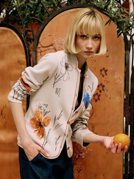 ist die Grundfarbe dieser schönen Strickjacke von Ivko, im Jacquardmuster im Blumenmuster mit den Farben zimt orange rost blau und dunkelbraun. Sie hat einen angeschnittenen Kragen, sehr angenehm am Hals, darunter einen kurzen V-Ausschnitt. Sie wird geschlossen mit rostfarbenen Knöpfen. Sie ist leicht tailliert. Die Saumkanten sind an der vorderen Mitte gerundet. Die Länge ca. 61 cm in Größe 38.