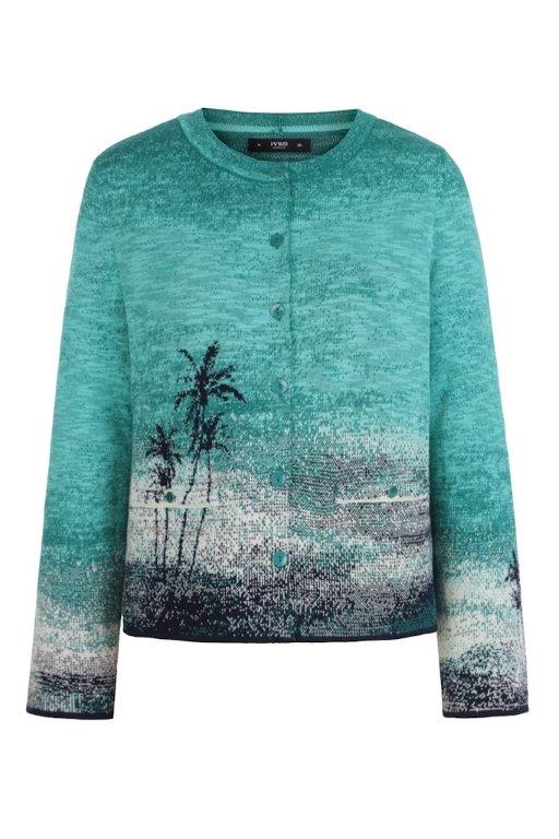 ist die Grundfarbe dieser schönen Strickjacke von Ivko, im Jacquardmuster im Urban Sun Muster mit verschiedenen Grüntönen und wollweiß. Die Jacke ist im Farbverlauf gestrickt mit Palmen auf dem rechten Vorderteil und dem Rückenteil. Die Strickjacke hat einen runden Halsausschnitt, wird geschlossen mit grünen Knöpfen. Sie ist leicht tailliert. Auf den Vorderteilen sind Taschen mit Knopfverschluß. Die Ärmel sind lang. Länge ca. 56 cm.