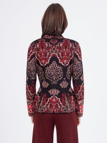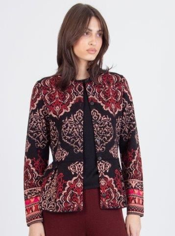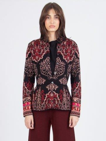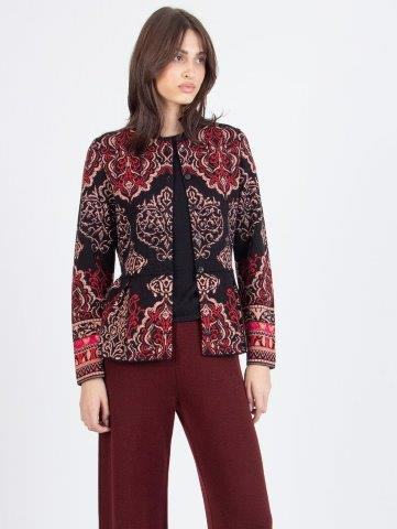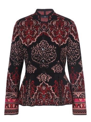ist die Grundfarbe dieser schönen Strickjacke von Ivko, mit Ornamenten in den Farben rot, rosa und ein wenig orange. Sie hat einen flachen Stehkragen, sehr angenehm am Hals, wird geschlossen mit schwarzen Knöpfen. Sie ist tailliert, ist unterhalb der Taillennaht nach unten ausgestellt mit eingelegten Falten ab Taille. Die Saumkanten der langen Ärmel sind im Bordürenmuster gestrickt. Diese Strickjacke sieht auch schön aus über dem Dirndl. Länge ca. 63 cm in Größe 38.
