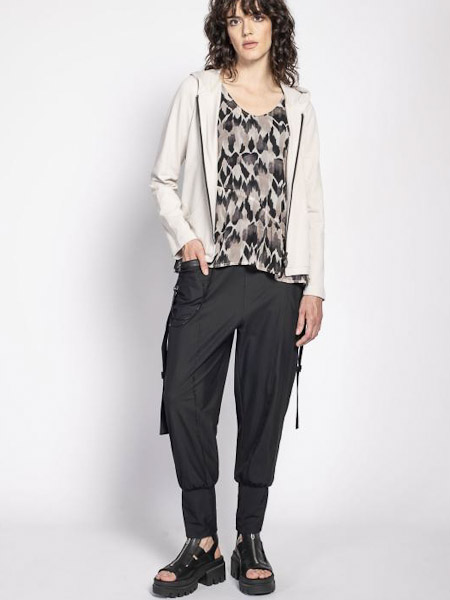 ist diese leichte Stretchhose von Vetono, wir haben sie in der Farbe schwarz. Sie ist aus einem elastischen leichten Stoff gefertigt. Sie hat einen 5 cm breiten Taillenbund mit Gummidurchzug, flach am Bauch. Die lässige Hose hat vorn 2 Taschen. Sie hat eine bequeme Weite am Oberschenkel und hohe schmale Bündchen am Saum. An den Seitennähten hat sie Bänder, die mit Metallschließen gehalten werden. Rockig ist die Metallkette, die an einer Metallöse am Bund hängt. Die Kette kann man auch entfernen. Länge ca. 98 cm incl. Taillenbund in Gr. 38. Innere Beinlänge in Gr. 38 = 65 cm.