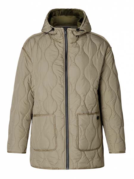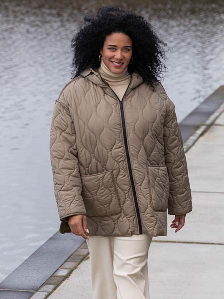 ist diese leichte Steppjacke Zita in der Farbe kahki von Yest. Das wasserabweisende Material schützt vor leichtem Regen, während die großen aufgesetzten Taschen und die Kapuze für zusätzlichen Komfort sorgen. Sie wird mit einem schwarzen 2 Wege-Reißverschluß geschlossen. Sie hat Schlitze an den Seitennähten, ideal auch beim Sitzen oder Radfahren. Sie ist in senkrechten Wellenlinien wattiert und schwarz gefüttert. Auch die Kapuze ist innen wattiert, sie kann mit Bändern in der Weite reguliert werden. Sie hat 2 große aufgesetzte Taschen. Länge ca. 80 cm in Größe 44.