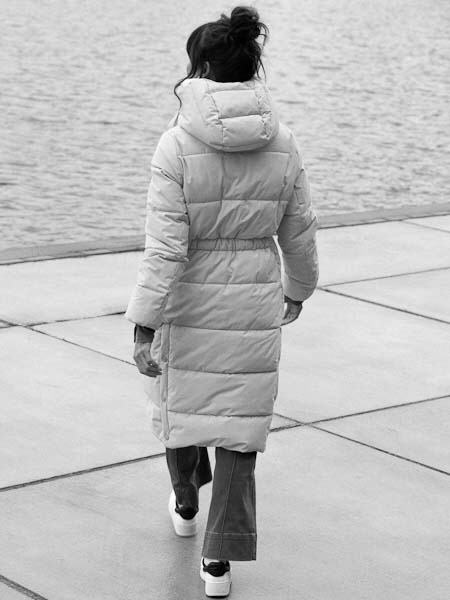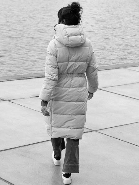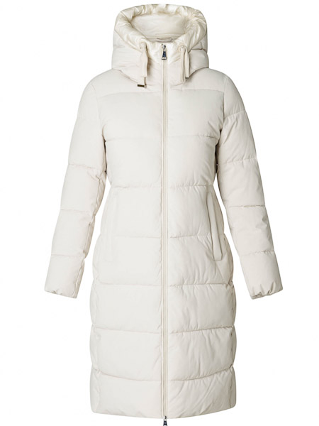 ist dieser Wintermantel Zara von Yest, wir haben ihn in der Farbe light sand, wollweiß. Er ist gefertigt aus einem matten, wasserabweisenden Material. Er ist dick wattiert, quer abgesteppt, bietet optimalen Schutz vor Wind, Regen und Schnee. Der 2-Wege-Reißverschluss und die Schlitze mit Druckknöpfen am Rückenteil sorgen für Bewegungsfreiheit beim Laufen, Sitzen oder Radfahren. Die Weite des Mantels ist am Rückenteil in Taillenhöhe innen mit Bändern verstellbar, zaubert eine Taillierung am Rückenteil. Der Steppmantel ist rehbraun gefüttert. Auf den Vorderteilen sind Pattentaschen mit Reißverschluß. Der Steppmantel hat eine große wattierte Kapuze, innen aus leicht glänzendem wollweißem Stoff. Die Weite der Kapuze läßt sich mit Bändern raffen. Länge ca. 113 cm in Größe 48.