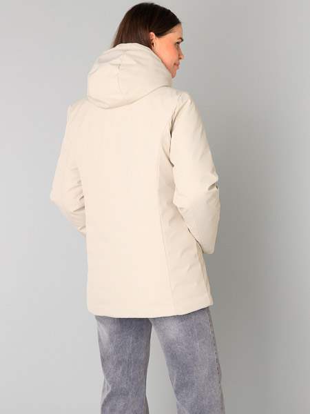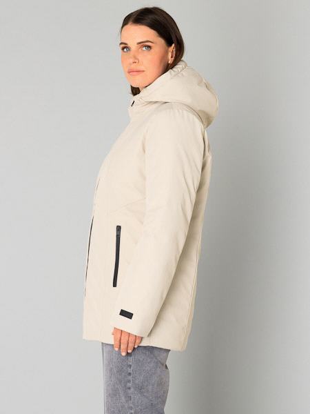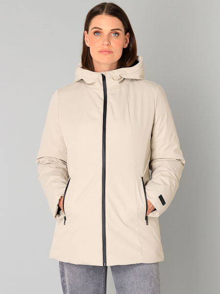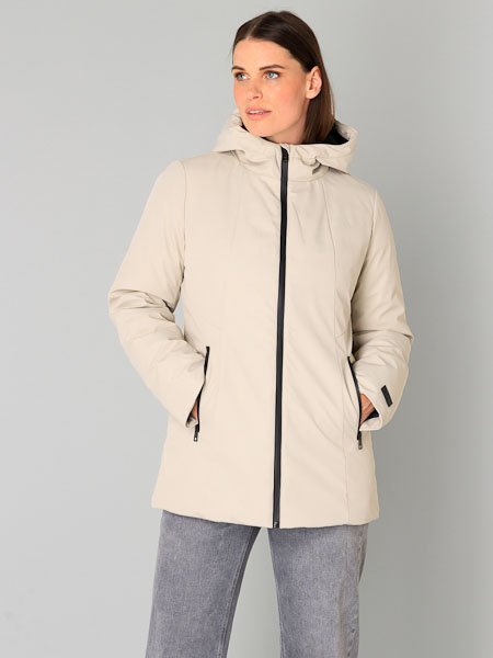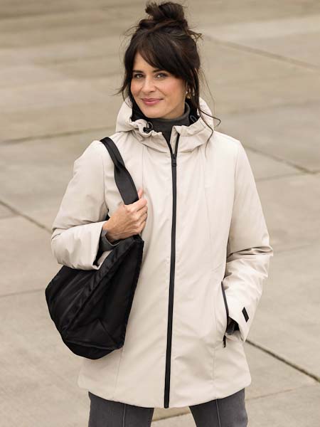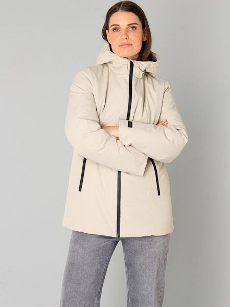 ist diese warme Winterjacke Zofia in der Farbe sand von Yest. Diese Winterjacke ist mit vielen technischen Details ausgestattet, um Sie vor Kälte zu schützen. Sie wird mit einem schwarzen 2 Wege-Reißverschluß geschlossen, ideal auch beim Sitzen oder Radfahren. Die verschweißten Nähte machen die Jacke wasserdicht, während der glatte Stoff für einen luxuriösen Look sorgt. Innen ist sie quer wattiert und schwarz gefüttert. Die Kapuze und die Reißverschlusstaschen bieten zusätzliche Funktionalität, und die Innentasche mit Reißverschluß bietet sicheren Stauraum. Auch die Kapuze ist innen wattiert. Die Jacke hat eingearbeitete Pulswärmer mit Loch für den Daumen. Diese sehr warme Winterjacke ist die ideale Wahl für ungemütliche Wintertage. Länge ca. 83 cm in Größe 48.