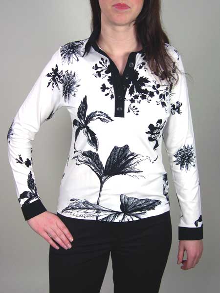 sind die Farben dieser Shirtbluse von Moya. Das Shirt ist leicht tailliert, hat lange Ärmel, Manschetten und Polokragen sind schwarz. Das Shirt ist von Gr. 36-46 lieferbar.