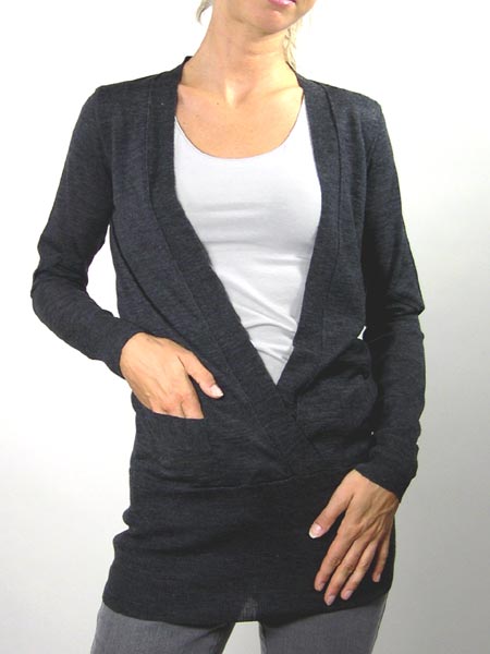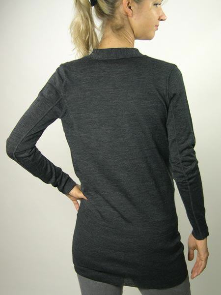 Pulli mit ganz tiefem V-Ausschnitt, in der neuen langen Form von Kapalua in der Modefarbe anthra. Der Pulli ist gerade geschnitten, hat einen breiten Rippenbund, Länge ce. 78 cm.Ein Top muss allerdings darunter getragen, wie dieses ärmellose Top von Crea.