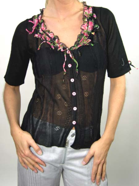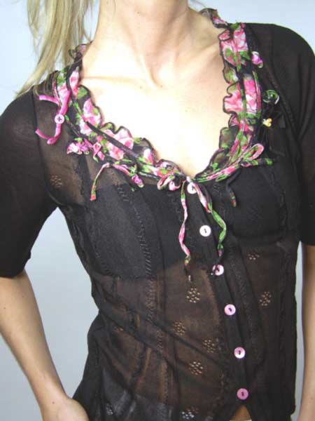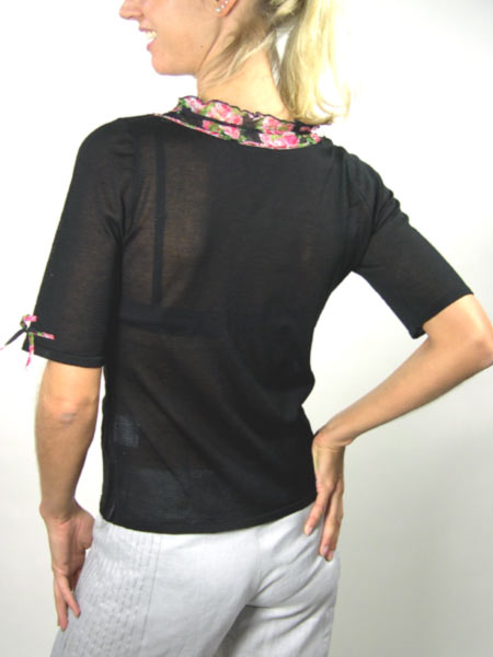 ist diese kleine Strickbluse von Tricot Chic, im zarten Lochmuster gestrickt. Der Ausschnitt ist geschmückt mit Bändern aus schwarz/rotem Blumenstoff, mit kleinen Schleifen, Samtbändern und gedrehten Röschen. Wer genau hinschaut, erkennt sogar eine kleine Biene.Sehr liebevoll gearbeitet!