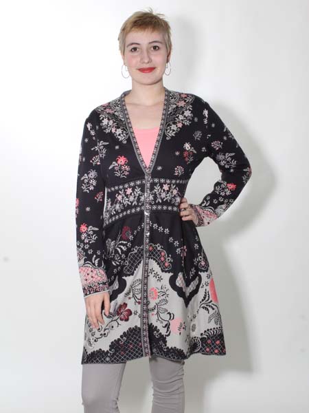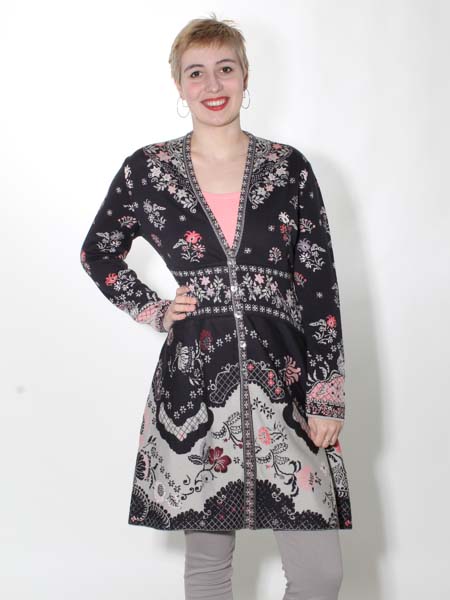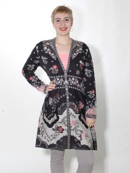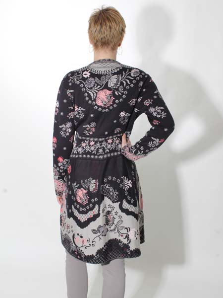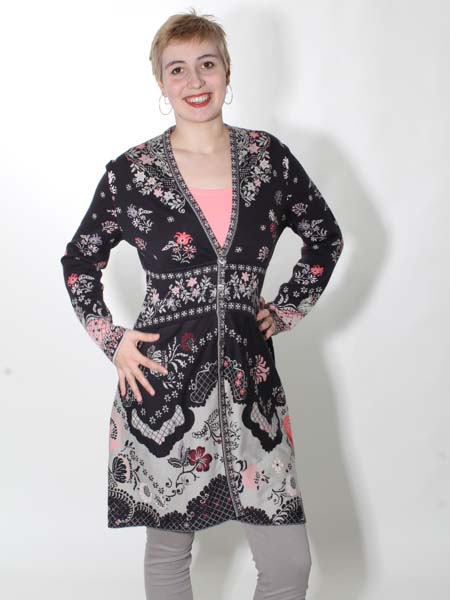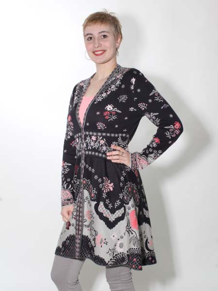 hat diese schöne lange Strickjacke, dieser Strickmantel von Ivko, in der Grundfarbe anthrazit dunkelgrau gestrickt (mit Blaustich, wirkt fast wie dunkelblau) mit floralen Mustern und Intarsien in den Farben rosa, silbergrau, apricot, aubergine.